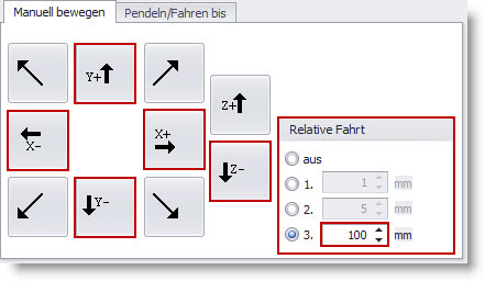 2.W okienku głównym cncGraF Pro przejść do "posuwu ręcznego" i korzystając z "jazdy relatywnej" przejechać maszyną dowolnie zdefiniowany odcinek, np. 100 mm, następnie kliknąć na odpowiedni symbol kierunku jazdy w osi, którą się zamierza sprawdzić.