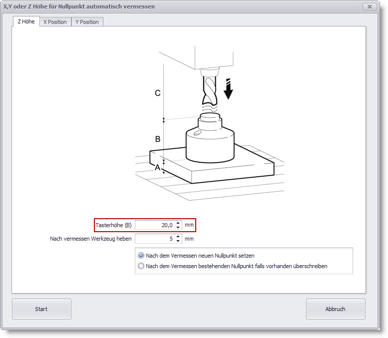 cncGraF Pro jest w stanie automatycznie wymierzyć wysokość Z (wymagana jest klawiatura!). Przy pomocy tej funkcji da się również automatycznie ustalić punkt zerowy dla osi X oraz Y. W tym celu wymagany jest czujnik dla 3D.