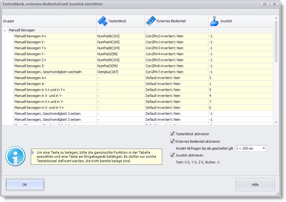 Abbildung: Einrichtungsmenü für Tastenblock, externes Bedienteil und Joystick