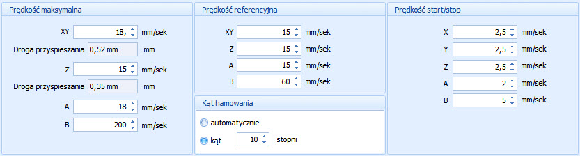 · Parametr Prędkość maksymalna określa maksymalną dopuszczalną prędkość, przy której maszyna poprawnie pracuje oraz nie gubi kroków.