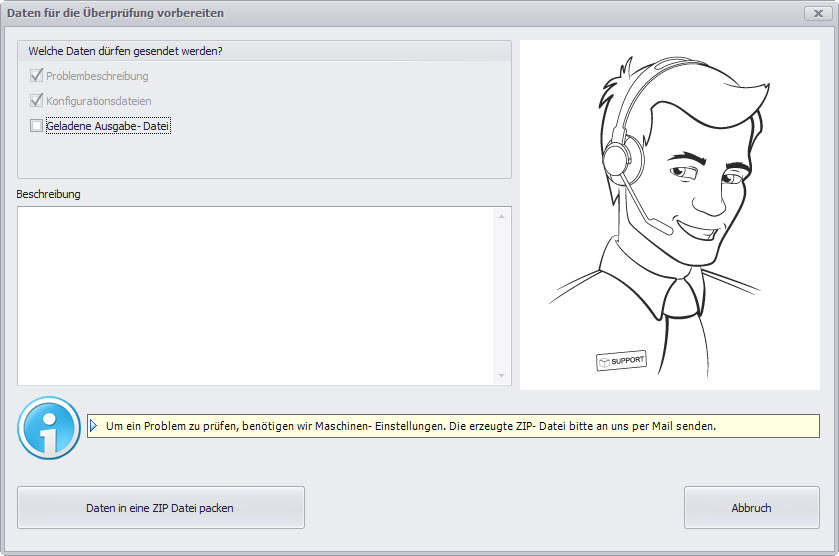Funkcja ta pozwala na utworzenie pliku typu ZIP, który zawiera istotne dane Państwa maszyny (plik konfiguracyjny) jak również ewentualnie dane dot. pliku wyjściowego (załadowny rysunek).Jest to o tyle korzystne, ponieważ użytkownik nie musi sam szukać za plikiem kofiguracyjnym - cncGraF Pro dokonuje tego sam. W polu opis należy przedstawić Państwa problem. Poza tym można zdecydować, czy plik wyjściowy ma być również wysłany. W tym przypadku nie należy stawiać haczyka w polu oznaczonym "załadowany rysunek".
