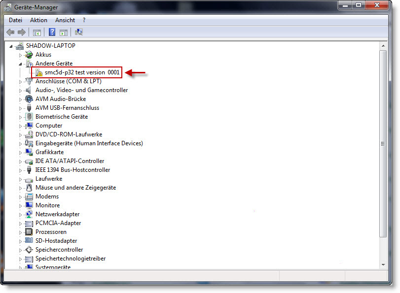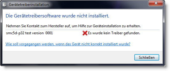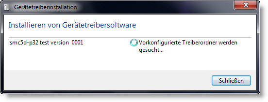 2. Jeżeli system nie znajdzie sterownika należy wówczas zamknąć okno dialogu i otworzyć Geräte-Manager (Start > Panel sterowania > Geräte-Manager). Kontroler SMC5D-p32 jest tam oznaczony pod "inne urządzenia" jako nie zainstalowany.