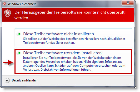 W tym dialogu należy potwierdzić "program mimo to zainstalować" . Sterownik zostanie wówczas zainstalowany i będzie rozpoznawany poprzez system operacyjny.