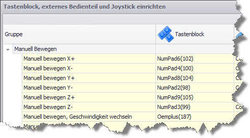 Po uaktywnieniu w okienku "Klawiatura, zewnętrzny panel, joystick" pozycji "włącz klawiaturę" można przyporządkować poszczególnym klawiszom (ich kombinacji) wybranego urządzenia wejściowego(wyposażonego w klawisze!) wybrane funkcje. Ponieważ tak zaprogramowane funkcje zostają uruchamiane natychmiast po naciśnięciu klawisza, należy rozważnie dokonać tego przyporządkowania .