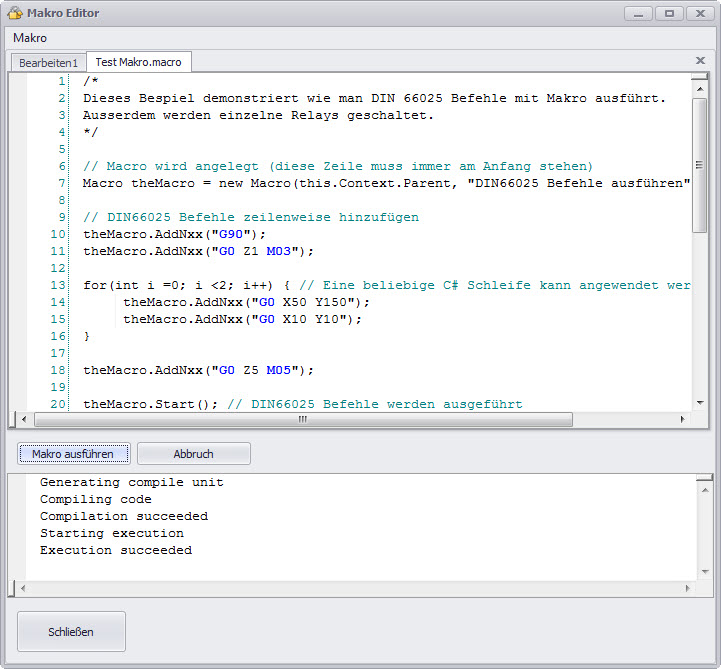 Po dokonaniu wyboru ukazuje się ono w okienku dialogu analogicznie do podanego przykładu "Test makro". Widoczne tutaj są pojedyncze wiersze z poleceniami programu, które można jednak dowolnie zmienić/dopasować do potrzeb.