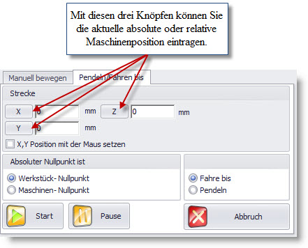Funkcji tych można użyć do najazdu na określoną pozycję (wychodząc od punktu zerowego materiału bądź też maszyny). Poprzez podanie danych dla współrzędnych X, Y oraz Z można najechać na żądaną pozycję bezpośrednio lub wahadłowo. Klawisz "Start" uruchamia jazdę, a klawisz "Przerwij" ją przerywa.