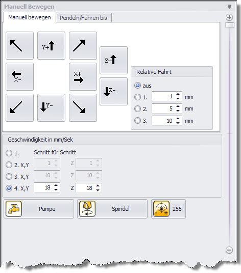 Można tu zdefiniować trzy różne szybkości jazdy (w mm/sek) dla osi X, Y oraz Z. Wybrana szybkość dotyczy funkcji "Poruszać przy pomocy klawiszy", "Jazda referencyjna" oraz "Jedź tam i z powrotem". Oprócz tego można uruchomić funkcję "Krok po kroku". Wykonuje się wówczas przesuw (1 kliknięcie = 1 krok) w wybranej osi. Funkcja ta obsługiwana jest tylko poprzez "Poruszać przy pomocy klawiszy" i służy do precyzyjnego ustawiania osi Z.