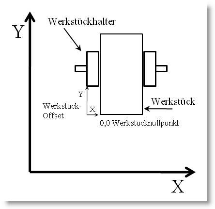 Pod pojęciem tym rozumie się tutaj odstęp pomiędzy oznakowanym uchwytem materiału, a punktem zerowym materiału (na ilustracji "x" oraz "y"). W formacie GRF są zapisane zarówno offset materiału jak i polożenie punktu zerowego materiału. Przy otwarciu GRF-pliku sprawdzeniu podlega położenie punktu zerowego materiału. Jeśli faktyczne położenie tego punktu jest inne niż to wynikające z załadowanego rysunku, pojawia się wówczas meldunek: