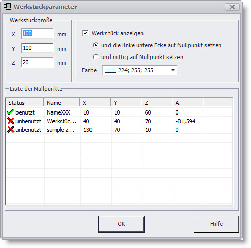 W celu ułatwienia kontroli można graficznie przedstawić wielkość oraz pozycję obrabianego materiału. Umieszczając materiał na punkt zerowy można się posłużyć lewym rogiem bądź się środkiem materiału. Zdefiniowana wielkość materiału w osiach X i Y przedstawiona jest w wybranych kolorach. Wyboru punktu zerowego dla materiału dokonać można z listy punktów zerowych.