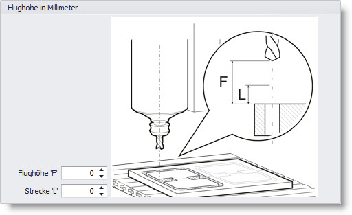 •Wysokość nalotu "F" jest to odstęp pomiędzy szpicem narzędzia, a materiałem obróbki w czasie jazdy jałowej. Odcinek "L" jest częścią wysokości "F", na którym ruch odbywa się z prędkością posuwu wzdłuż osi Z. Dla "L" = 0 lub jeśli L>F następuje obniżanie się na całym odcinku z prędkością maksymalną. Wysokość nalotu można ustalić automatycznie naciskając przycisk