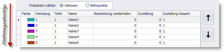 Dla danych w 3D nie da się zmienić kolejności obróbki. Różne głębokości "Z" pomiędzy danymi narzędzi spowodować mogą ukośną jazdę w osi Z. W tym przypadku przyciski ze strzałkami nie są widoczne. |