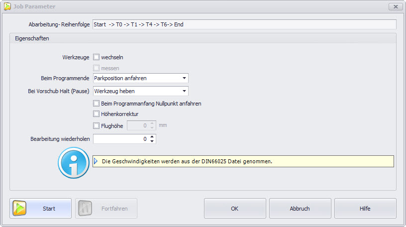 DIN 66025 określa stałą i niezmienialną kolejność narzędzi. Kolejność ta widoczna jest dla użytkownika w okienku "Parametry pracy".