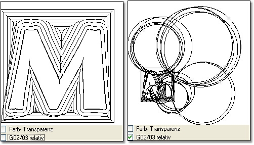 Ilustracja: Dla lewego rysunku zostało wybrane polecenie "G02/03 absolutne"; z kolei dla prawego rysunku polecenie "G02/03 względne".