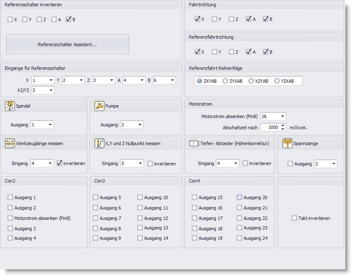 W menu "Parametry pinów" dokonuje się nastawy takich funkcji jak: start/zatrzymanie wrzeciona, otwórz/zamknij dla uchwytu narzędzi, ustawienie łączników referencyjnych oraz przyporządkowanie innych funkcji dla odpowiednich wejść/wyjść.