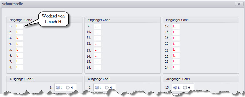 3. Po kolei należy ręką poruszyć poszczególne łączniki. Jeśli zmieni się w polu poszczególnego pinu "Wejścia: Con2" status z L na H znaczy to, że odpowiedni pin został zidentyfikowany.