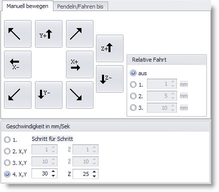 W celu dokonania jazdy na konkretnym odcinku należy uaktywnić w dolnej części okna dialogu "Szybkość w mm/sek" 4-ty punkt. Jeśli maszyna porusza się w prawidłowym kierunku (X - = jazda na osi X w kierunku zera) nie należy dokonywać jakichkolwiek zmian w tej osi. Jeśli zaś maszyna porusza się niewłaściwym kierunku, należy dokonać zmiany kierunku ruchu (inwersji) w punkcie menu "Kierunek ruchu" poprzez usunięcie haczyka przy X (standardowo zaznaczone są haczyki). Analogicznie postępuje się z innymi osiami.