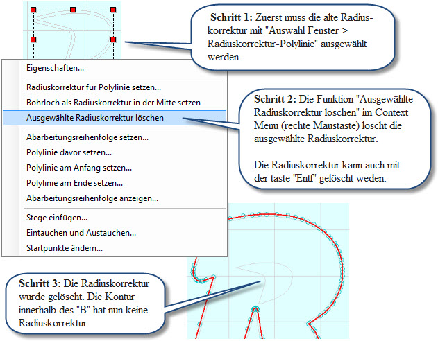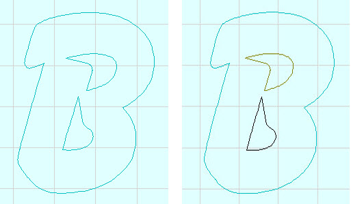 Po przeprowadzeniu korekty średnicy narzędzia dla w.w.przypadku niektóre z polilinii obliczone zostają błędnie (wewnętrzne fragmenty "B"). Oczywiście jest to niepożądany rezultat, ponieważ dla tego wewnetrznego fragmentu "B" obróbka musi się odbyć od jego strony wewnętrznej, a nie zewnętrznej konturu. Aby jednak obróbka dokonana jedynie wzdłuż tych poprawnie obliczonych, należy wpierw usunąć te błędnie obliczone