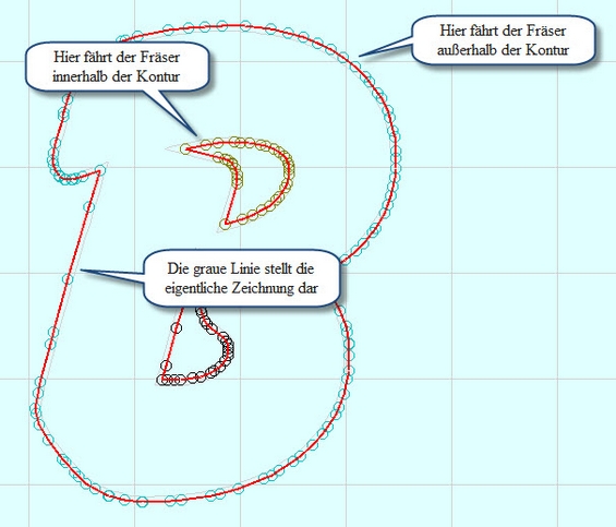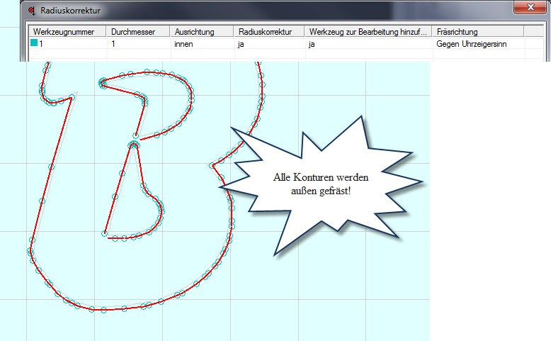 Przy użyciu tylko jednego narzędzia i dokonanej korekty jego średnicy wynika z tego ograniczenie, że podana pozycja narzędzia w stosunku do konturu (wewnątrz/zewnątrz) zastosowana będzie dla całego rysunku.
