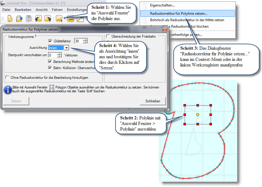 Należy zatem wybrać pod "wybór okna" odpowiednią polilinię i ją zamarkować. Następnie wejść do menu kontekstowego (prawy klawisz myszki) i przejść do pozycji "Postaw korektę narzędzia dla polilinii" (dialog ten wywołać można alternatywnie z lewego paska narzędzi). Po otwarciu się okienka dialogu można ustawić "Kierunek" na wewnątrz. Po dokonaniu tych nastaw należy w celu ich potwierdzenia nacisnąć klawisz "Postaw". Nastąpi wówczas obliczenie korekty średnicy narzędzia dla tej polilinii.