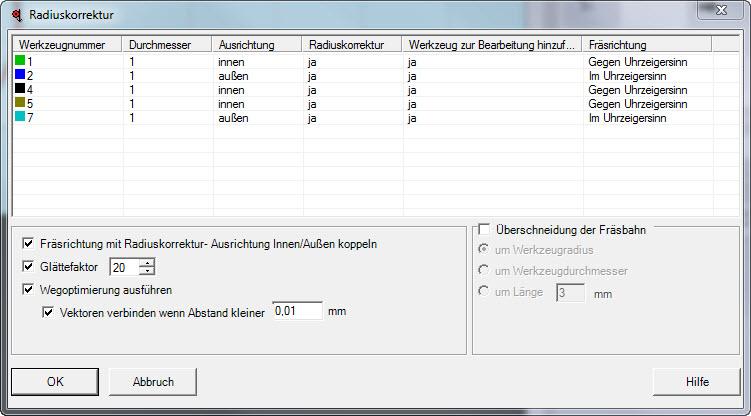 Po ustaleniu tych parametrów dokonać można dalszych ustawień jak np. czy powiązać należy kierunek frezowania z korektą średnicy narzędzia (wewnątrz/zewnątrz). Poza tym ustalić można faktor wygładzania oraz uaktywnić optymalizację drogi. Ponadto dokonać można nastawy, by wektory znajdujące sią od siebie w odstępie mniejszym niż X zostały ze sobą połączone.