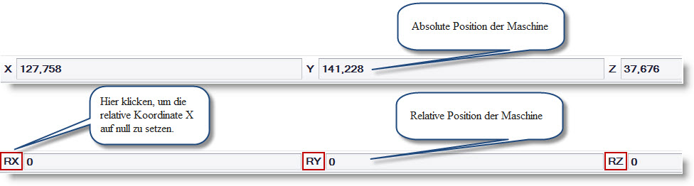 Ilustracja 1: Dwa górne paski współrzędnych (absolutnych oraz względnych) maszyny