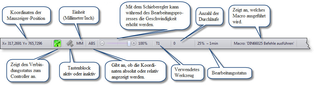 •Z kolei dolny pasek pokazuje współrzędne myszki, aktualne jednostki miary, oraz ogólny aktualny status maszyny (postęp w obróbce w % i oczekiwany czas obróbki, złącza, rodzaj wybranych współrzędnych, nr narzędzia, używane makra).