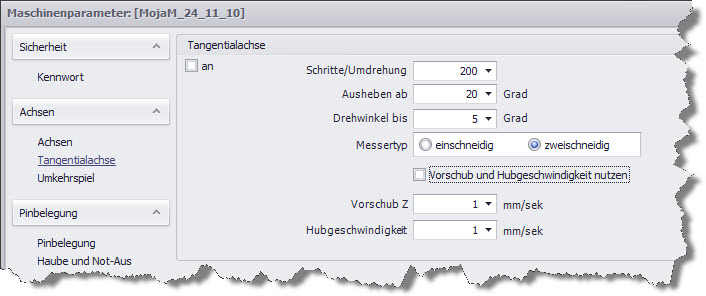 W celu włączenia osi stycznej prosze przejść w menu głównym do "Parametrów maszyny" a następnie do osi stycznej. W poniżej przedstawionym okienku dialogu należy dokonać wymaganych nastaw.