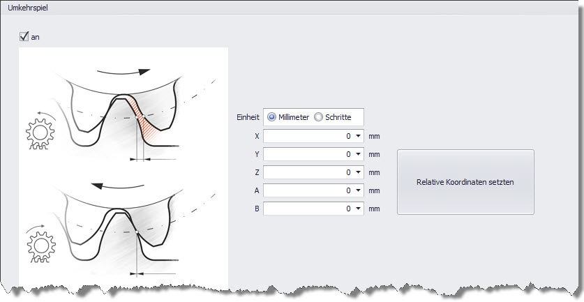 Luzy występują przy zmianie kierunku ruchu i są negatywnym zjawiskiem wynikającym z rodzaju zastosowanej mechaniki przenoszenia ruchu. Pochodzą one np. z luzów konstrukcyjnych między gwintem wrzeciona a nakrętką, czy też pomiędzy zębnikiem a zębatką przy czym spostrzega się je wyraźnie w czasie zmiany kierunku ruchu. Aby skompensować ewtl. luzy należy wpisać w poniżej przedstawionym oknie dialogu odpowiednie wielkości tych luzów. Dane te można podać w mm lub liczbie kroków.