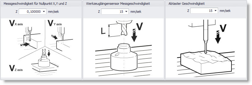 W polu pierwszym definiuje się prędkość najazdu czujnika 3 D na materiał w celu określenia punktu zerowego osi X i Y. I tutaj należy ostrożnie dokonać wyboru prędkości z uwagi na to, że czujnik posiada krótką drogę włączania/wyłączania. Jednak przy wyborze zbyt dużej prędkości powstaje ryzyko uszkodzenia tego czujnika poprzez zbyt krótką drogę wyhamowania przy kontakcie jego z materiałem obróbki.