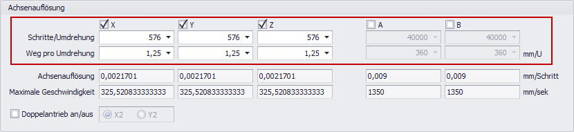 Sind die Werte eingegeben, ermittelt cncGraF Pro umgehend die Achsenauflösung (mm/Schritt) und die maximale Geschwindigkeit (mm/sek.) Ihrer Maschine. Mit den Kästchen neben den Achsbezeichnungen können Sie jede Achse aktivieren oder deaktivieren. Haben Sie eine Standardkonfiguration mit 3 Achsen sind nur die Häkchen bei X, Y und Z gesetzt. Die Achsen A und B können für spezielle Bedürfnisse eingesetzt werden (z.B. als Drehachse oder Schwenkachse).
