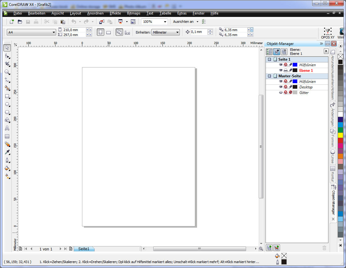 Jetzt müssen noch die Marken hinzugefügt werden. Öffnen Sie hierfür die Datei mit der Kalibrierungsvorlage und kopieren eine Marke von dort in das aktuelle Dokument. Diese wird dreimal vervielfältigt, so dass vier Marken vorhanden sind.