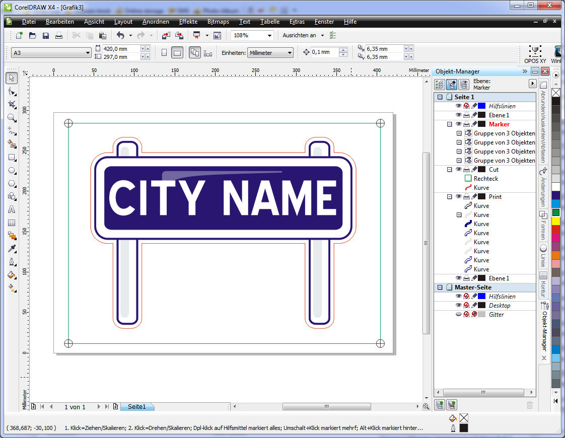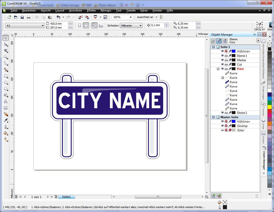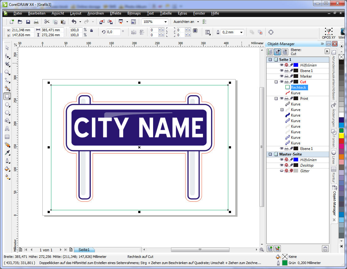 Starten Sie Corel Draw wieder mit einem leeren Dokument. Jetzt legen Sie drei neue Ebenen/Layer an und benennen Sie diese um in Print, Cut und Marker. Wählen Sie die Ebene Print zur aktiven Ebene und importieren dann das zu druckende Objekt. In unserem Fall ein Schild das auf einem Plattendrucker gedruckt wird und anschließend die Kontur ausgefräst wird.