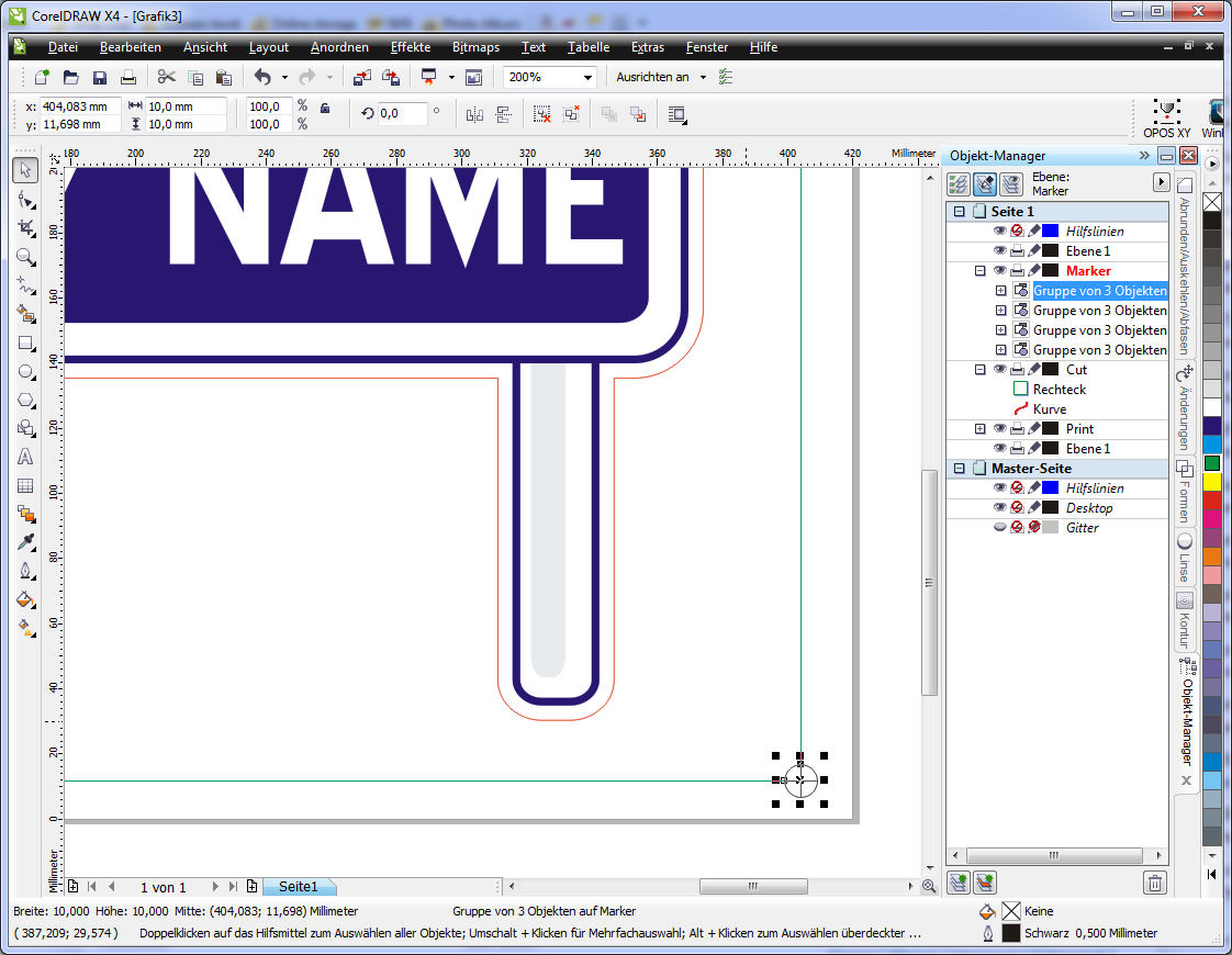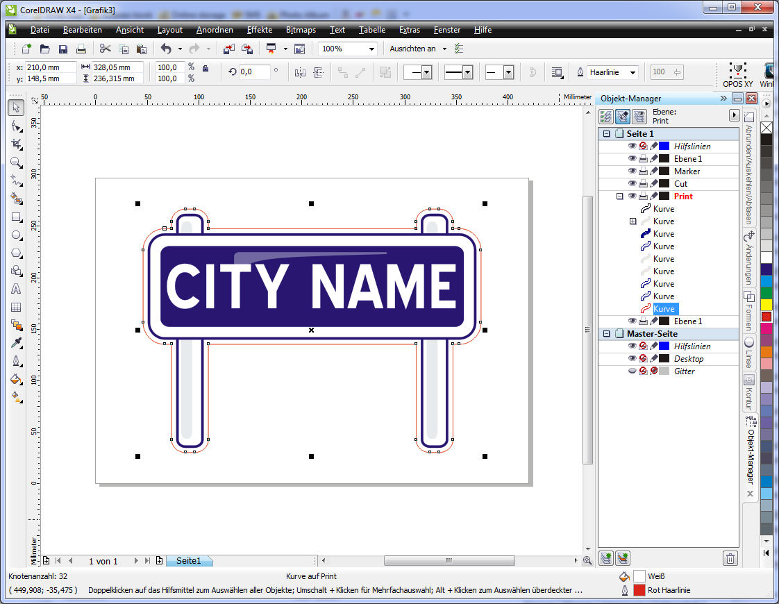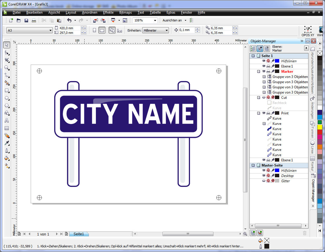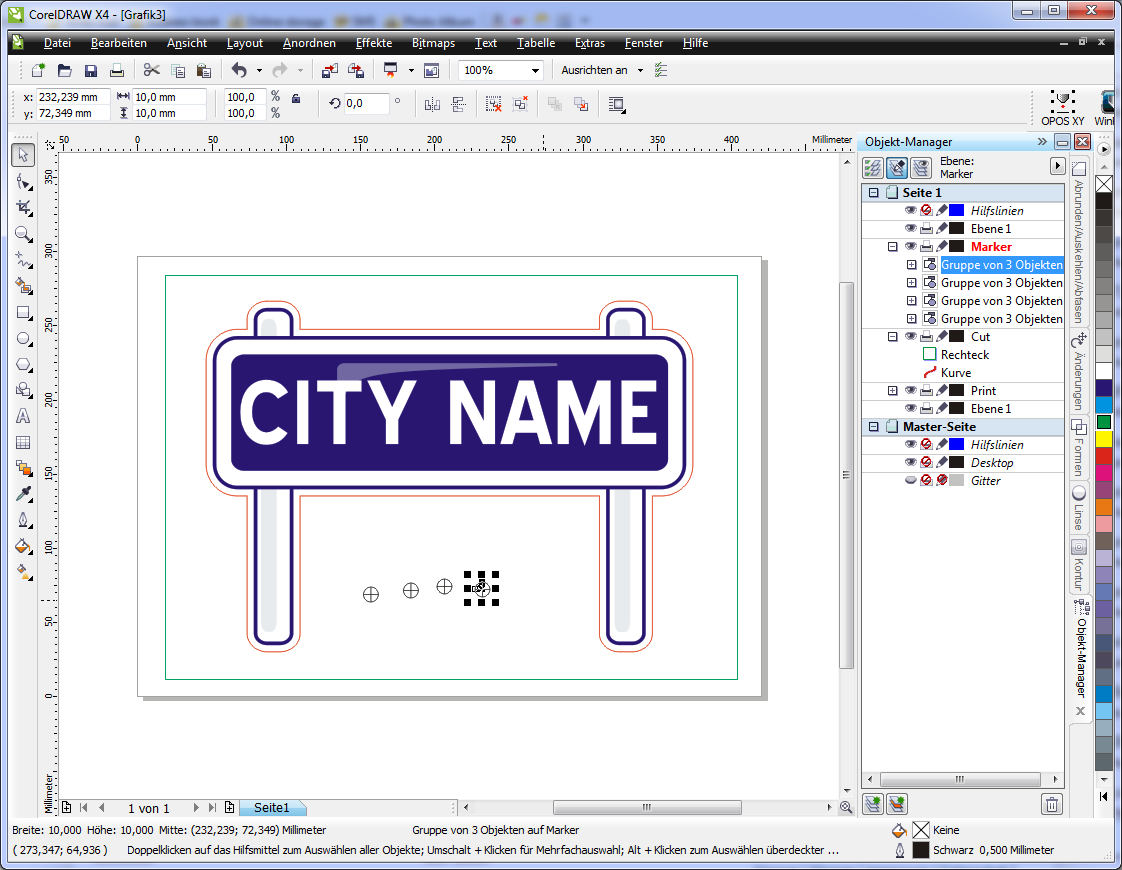 Starten Sie Corel Draw wieder mit einem leeren Dokument. Jetzt legen Sie drei neue Ebenen/Layer an und benennen Sie diese um in Print, Cut und Marker. Wählen Sie die Ebene Print zur aktiven Ebene und importieren dann das zu druckende Objekt. In unserem Fall ein Schild das auf einem Plattendrucker gedruckt wird und anschließend die Kontur ausgefräst wird.