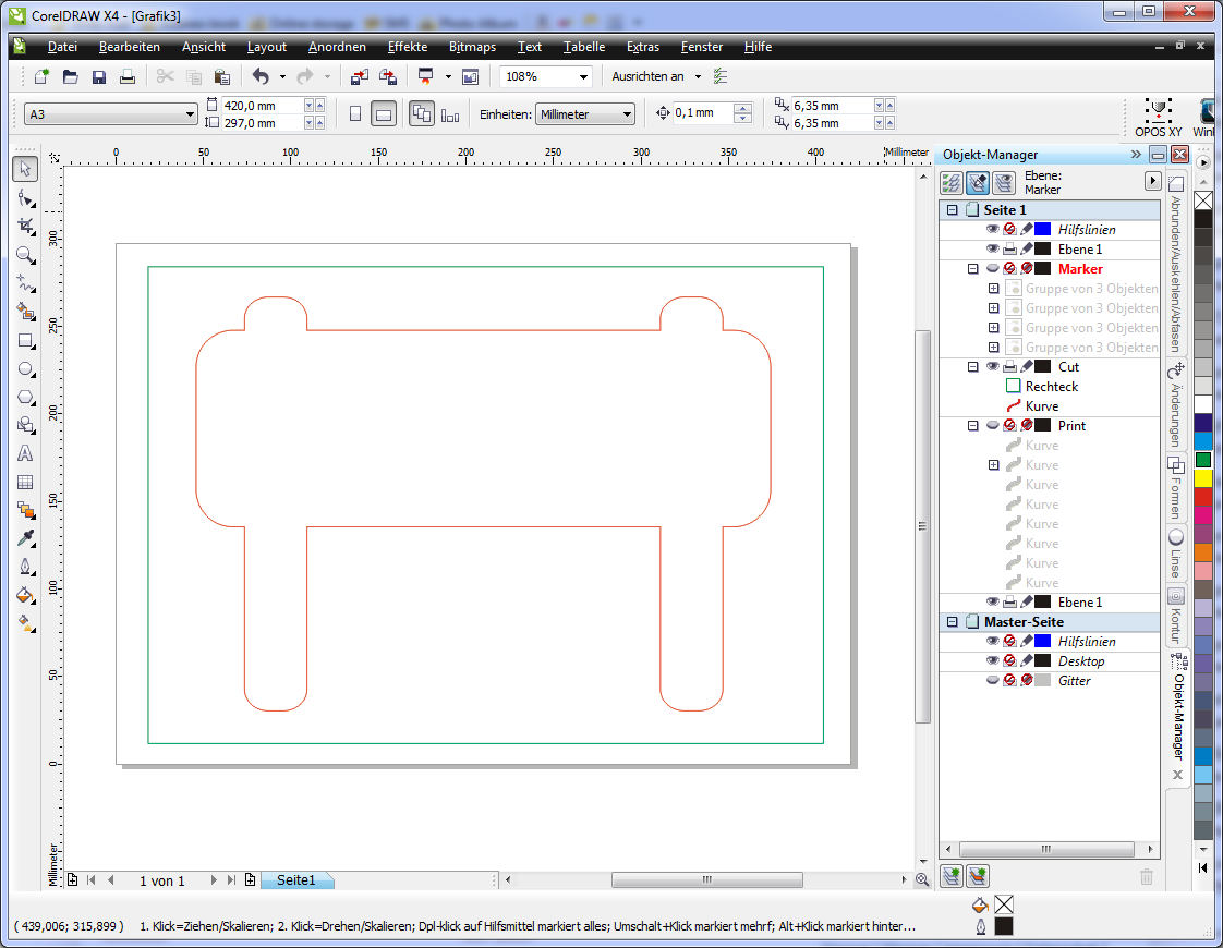 Erstellen Sie nun ein Rechteck, welches die komplette Grafik einschließt und weisen Sie diesem ebenfalls eine markante aber unterschiedliche Farbe für die Linie zu. Diese muss auch auf der Ebene Cut liegen.