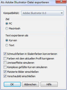 Für die Schneide-/Fräsdaten wird die Ebene Print und Marker ausgeschaltet. Anschließend erfolgt der Export. In unserem Fall über Adobe Illustrator. (siehe Dialog).
