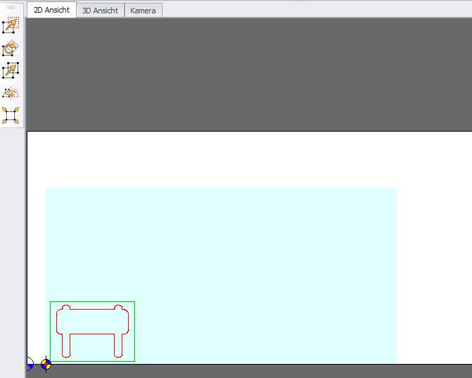 Das Rechteck, welches um die Kontur gelegt wurde dient lediglich der Definition der Blattgröße und wird nicht mit geschnitten/gefräst. Über das Werkzeuglager in cncGraF Pro kann dieses Werkzeug deaktiviert werden. Die gedruckte Platte kann nun auf die Fläche der Fräse gelegt werden und die Markenerkennung gestartet werden.