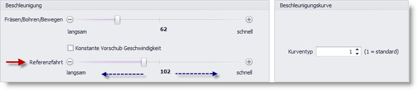 Führen Sie hierzu eine Referenzfahrt aus. Fährt die Maschine zu "hart" auf die Referenzschalter auf, müssen sie den Wert mit dem Schieberegler erhöhen. Dies machen Sie solange, bis Sie die optimale Geschwindigkeit eingestellt haben.