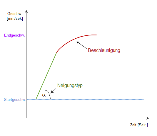 Die Anfahrrampe können Sie durch Verstellen des Schiebereglers einstellen. Je höher der angezeigte Wert ist, um so steiler (schneller) ist die Anfahrrampe. Außerdem können Sie die Rampe durch Verstellen des Kurventyps beeinflussen. Wenn Sie den Kurventyp verändern, ändert sich der Beschleunigungs- bzw. Abbremsweg (dies können Sie unter "Eilgeschwindigkeit > Beschleunigungsweg" sehen). Standardmäßig ist der Kurventyp auf Stufe 1 (Skala von 1 bis 6). Je höher der gewählte Wert ist, umso kürzer wird der Beschleunigungsweg. Das Verstellen des Kurventyps ist jedoch nur sinnvoll, wenn Sie eine Maschine mit sehr hoher Maximalgeschwindigkeit haben (z. B. 300 mm/sek).
