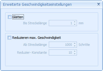 Im Bereich Kurvengeschwindigkeit befinden sich erweiterte Geschwindigkeiteinstellungen. Die Funktion Glätten reduziert die Beschleunigung auf sehr kurzen Strecken (bis 2mm).