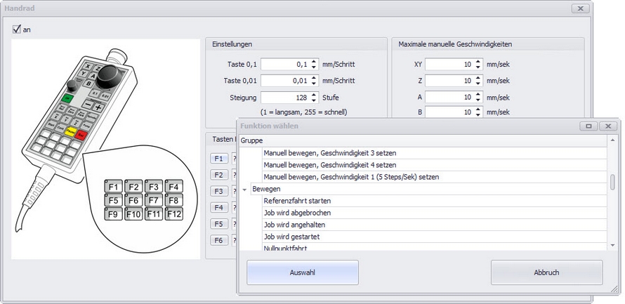 Steuerung der Maschine mit Handrad und Zuweisung von Funktionen |