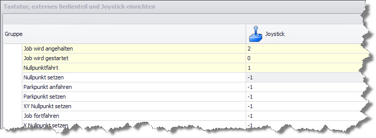 cncGraF Pro kann eine Maschine mit einem Joystick ansteuern. Diese Funktion kann im Menü "Einstellungen > Eingabegeräte > Tastatur, externes Bedienteil, Joystick einrichten" aktiviert oder deaktiviert werden. Zusätzlich können die Tasten des Joysticks mit Funktionen wie "Manuelle Geschwindigkeiten wechseln", "Referenzfahrt", "Nullpunktfahrt" etc. belegt werden. Der Wert "-1" schaltet die Funktion aus.