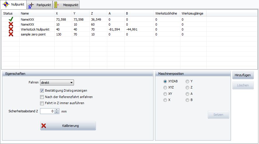 Es können beliebig viele Nullpunkte, Parkpositionen oder Messpositionen angelegt werden, aber jeweils nur einer dieser Punkte kann den Status "benutzt" haben. Deshalb wird immer maximal ein Nullpunkt