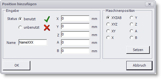 Durch das Anklicken des Buttons "Hinzufügen" erscheint das Eingabefenster "Position hinzufügen". Jetzt können die Parameter des Punktes (X-, Y-, Z-, A-, B- Koordinaten, Status und Name des Punktes) eingegeben werden. Durch das Betätigen des Buttons "Setzen" können die aktuellen X-, Y-, Z-, A-, B- Maschinenkoordinaten in die Felder übernommen werden (siehe Abbildung).