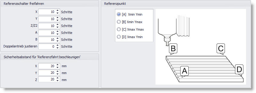 Bei der Einrichtung der Referenzschalter und der Referenzfahrt sind mehrere Punkte zu beachten. Im Menüpunkt "Achsen" können die Werte für das Freifahren der Referenzschalter eingestellt, die Position des Referenzpunktes festgelegt und der Sicherheitsabstand für die beschleunigte Referenzfahrt angegeben werden.