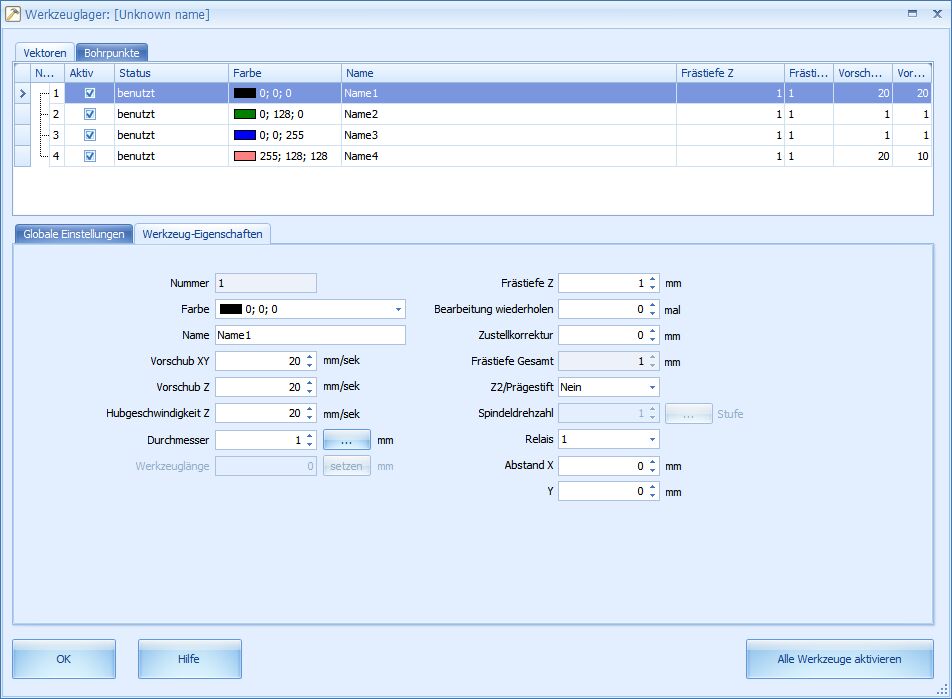 Das Dialogfenster "Werkzeuglager" verwaltet zwei Werkzeuglisten - Vektoren (für HPGL und optional für DIN 66025, siehe "Optionen") und Bohrpunkte (nur für Sieb & Maier) - die jeweils bis zu 100 Werkzeuge verwalten. Jedem Werkzeug können diverse Eigenschaften wie Vorschubgeschwindigkeit, Eintauchtiefe, Durchmesser, etc. zugewiesen werden, um sie beim späteren Fräsvorgang oder bei der Berechnung der Radiuskorrektur automatisch zu nutzen. In der Kolumne "Aktiv/Nr" können einzelne Werkzeuge deaktiviert bzw. aktiviert werden. Die Polylinien der inaktiven Werkzeuge werden in der Zeichnung nicht angezeigt und später im Fräsvorgang nicht verwendet.