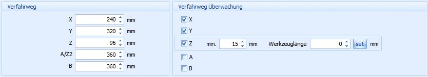 Im Abschnitt "Verfahrweg" wird der Arbeitsbereich der Maschine festgelegt. Die hier eingegebenen Daten entsprechen dem Bereich, der maximal mit der Maschine bearbeitet werden kann. Die entsprechenden Werte sind entweder dem Handbuch der Maschine zu entnehmen oder können durch ausmessen festgestellt werden.