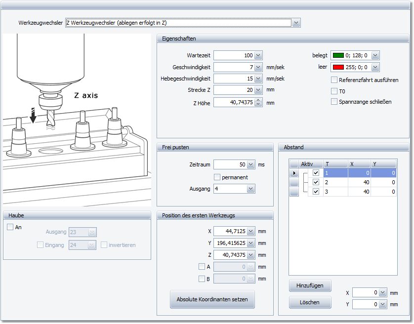 In der hier abgebildeten Maske werden alle Einstellungen des Werkzeugwechslers vorgenommen.